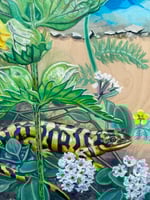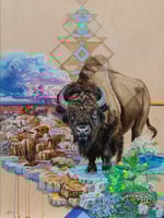 This piece was born when awakening in Yellowstone several times last summer to pre-dawn thunderstorms, then spending the day with bison, who are true embodiments of the grounded, solid Earth element. We often gaze across the rolling hills and realize what we first thought were boulders are their brown humps camouflaged perfectly with the landscape. These magnificent creatures are a keystone species in the Prairie ecosystem. We have seen the hollows of bison footprints in ancient geothermal pools, providing a place for bacteria to collect and proliferate. The plants in the foreground of the painting grow in buffalo wallows, which collect rainwater and create a habitat for salamanders and flowers. I fell in love with one of these enchanting yellow flowers, called Meadow maker, which is perceived by some to be an obnoxious plant. It is hemiparasitic on dominant grasses which creates species diversity and returns hay fields to healthy meadows.